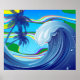 Big Blue Ocea Sea Wave på tropiska och färglösa Himlar och Handflatan träd, en perfekt för Roligt och Surfa av sommarHelgdagar! Original Vector Graphic Art Copyright BluedarkArt TheChameleonArt.