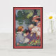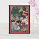 Vintage färgstark illustration av en familj sitta på en flod som läser en berättelse. Mor och tre barn ser coola och bekvämt ut under grenarna av en grönt träd. Röd och svart gräns.Allt visitkort. Anpassa som du vill