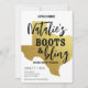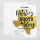 Gör hennes Texas Sängvätning drömmar till verklighet med denna fantastiska Stövlar & Bling Texas Sängvätning Inbjudan. Fokusera på den lyckliga damen med dess glamourösa svarta och gyllene design och Texas guldkarta, redo för henne att sparka upp stövlarna och ha en bra tid!