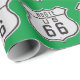 Roligt Route 66-presentationen är papper med det klassiska vägmärket på den ljusa gröntens bakgrund. Grönt att åka - gå på en resa.