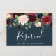 Ange reserverade platser på ditt bröllop med denna stilrena blommiga skylt i ädelstenstony. Anpassa med två rader anpassad text i kalligrafi och modern blockbokstav (visas med "Reserverat" och namnet på gästen med reserverad plats), inramad av frodiga akvarellblommor och grön lövverk i rika höstnyanser på en marinblå bakgrund.