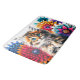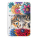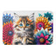 En strålande kattunge med mjuk päls och ljusa blå ögon sitter omgiven av livfulla, geometriska blommor som sprutar ut djärva färger och intrikat symmetri. Den slående kontrasten mellan den känsliga kattungen och de livfulla blomsterformerna skapar en fängslande blandning av mjukhet och dynamisk visuell energi.