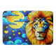 Ett strålande lejon med en flödande gyllene manke stirrar framåt, omgivet av en levande natthimmel fylld med en lysande måne, virvlande moln och ljusa stjärnor. De djärva färgerna och intrikata mönstren skapar en slående, drömlik scen som blandar himmelsk skönhet med kraftfull djur närvaro.