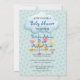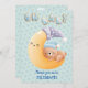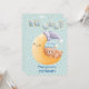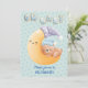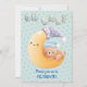 Här är en fin babyduschinbjudan som har en liten brun björn i en blå hatt som sover på en leende gult krescent måne. Måne har en lavender och en vit hatt. Text i stiliserad cookie-typ blå mönster står "OH BABY" överst och mörkblå text vid grund säger "gå med oss till CELEBRATE!" Bilden och texten placeras på en subtil blå stjärna. Baksidan av inbjudan har gott om utrymme för din egen anpassningsbar och upprepar den blå stjärniga bakgrunden, med en extra bild av ett moln med bilagor till konstellationen. Cute!