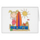 En blond haired stick figurflicka med en surfingbräda bygger ett sandslott under en le sommarsol på STRANDT-tröja, hoodies, bodysuits, kort, klistermärkear, strand hänger lös, magneter och mer.