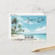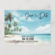 Meddela din drömbryllup i paradiset med detta Strand Bröllopsdestination Spara Datum vykort! Med en mjuk akvarell stranddesign med lugna havsvågor, sandiga stränder och en solkysst himmel, sätter detta vykort den perfekta tonen för ett tropiskt, kustnära eller öbröllop.
