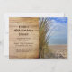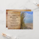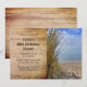 Rustik strand födelsedagsfest inbjudan mall för en vuxens födelsedag. Havsutsikt genom de gräsbevuxna sanddynerna är bilden på ena halvan av denna horisontella fest inbjudan. Mörkbrun text är tryckt över träskivor bakgrund med moderna teckensnitt.