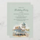 Kvinnlig födelsedagsfestinbjudan med akvarellmålning av ett vackert strandhus/sjöstuga med palmer