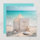 Ett tomt kort och kuvert vilar på en sandstrand omgiven av snigelhus, en sjöstjärna och en turkos havs bakgrund..