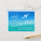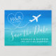 Blå och teal ombre vattenfärg strandbröllop spara datum-kort med rolig flygplanshjärtmonogram.