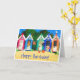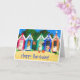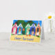En handpainted papper collage av stranden förlägga i barack för ett ljust och färgglatt födelsedagkort. Tom insida för ditt egna meddelande.