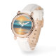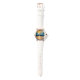 Denna klocka förkroppsligar den lugna skönheten hos en havsstrand vid solnedgång och fångar essensen av lugn och stillhet. Urskivan visar en hypnotisk scen av solen som sjunker under horisonten och målar himlen i en kalejdoskopisk variation av varma nyanser som sträcker sig från gyllene gula till eldröda orange och mjuka lila. Silhuetter av palmer svajar försiktigt mot bakgrunden och deras graciösa former speglas i de skimrande vattnen nedanför.