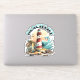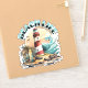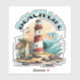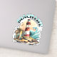 Strandiga klistermärken. Illustration av en strandscen med fyr, surfbrädor, palmer och delfin.