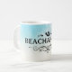 Kaffe kopp för strandälskare med vattenfärg strand och ordet "strandnarkoman" med accent element, flip flops ikon