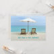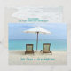 Strandstolar ny adress ankomstkort. Anpassa texten på framsidan och baksidan. Stolar i sanden under ett parasoll med utsikt över ett turkost hav är bilden på framsidan. Inkludera ny adressinformation på baksidan över en strandscen som inkluderar ett stort snigelskal. Perfekt för de som går i pension eller flyttar till paradiset!