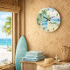En vattenfärgad sandstrand, oceanen vågar och handflatan träd som bakgrund, och en blå ytskiva på stranden. Anpassa och lägg till ett namn.