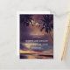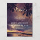 Beach- eller destinationsbröllop spara datumvykort med handflatan, lila solnedgång och sträng ljus