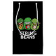 Strängbönor Rollig Grönsak Puns har en söt trio av bönor som spelar stränginstrument - gitarr, elgitarr och banjo. Perfekt present för familj och vänner som älskar söta musikbönepunsar.