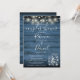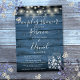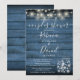 En rustik bröllopsinbjudan för par med vackra strängljus och murskål med stilfull skript typografi, på en blå rustik träd bakgrund. Designad av Thisisnotme