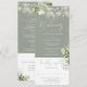 En allt-i-ett salvia grön bröllopsinbjudan med fina strängljus, rustik botanisk blomstergrönska och elegant typografi. Inbjudan inkluderar ett svarsbrev som kan klippas av och detaljer om gästinformation. Designad av Thisisnotme©