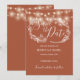 Ett stilrent boho terrakotta bröllop spara-datum kort med vackra strängljus och känsliga blomillustrationer på en terrakotta bakgrund. Anpassa med din speciella spara-datum information. Designad av Thisisnotme©