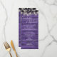Rustik bröllopsmeny kort med vackra strängljus och signatur stil namn, detta stilrena meny kort kan anpassas med din information i chic vit bokstäver på en lila träpaneler bakgrund. Designad av Thisisnotme