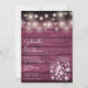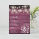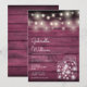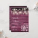 En stilren rustik bröllopsinbjudan med vackra strängljus och murade glasburkar. Det lyckliga parets namn är skrivna i ett elegant skrivstil ovanför de speciella bröllopsdetaljerna på en rustik burgunderfärgad träbakgrund. Baksidan har en matchande rustik träbakgrund. Designad av Thisisnotme©