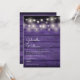 En stilren rustik bröllopsinbjudan med fina strängljus ovanför det lyckliga parets namn i ett elegant skrivstil ovanför de speciella bröllopsdetaljerna på en rustik lila träbakgrund. Baksidan har en matchande rustik träbakgrund. Designad av Thisisnotme©