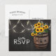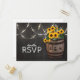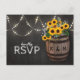 Stilrena country bröllop RSVP-kort med en rustik svart tavla bakgrund, sträng glödande ljus, sommar gyllene gula solrosor, ett vingårdsfat av trä med era initialer och en bit knuten snur