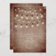 Vintage Edison-strängljus hängande från toppen över väderbiten rustik tegelbakgrund. Allmänt festinbjudan lämplig för födelsedag, bröllop, öppen hus, inflyttningsfest, professionell, stor invigning, årsdag, middagsbjudning etc.