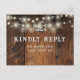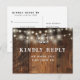 Ett rustikt RSVP-kort med strängljus, hästskor och stilfull typografi på en bakgrund av lada trä. Baksidan visar dina detaljer och en rolig önskan om gästlåt. Designad av Thisisnotme©