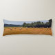 En panoramisk landsbygd med stora runda halmbalar i ett nymott fält av vete med en bakgrund av träd under blå himmel.
