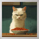 Bilden skildrar en vit katt med ett allvarligt, nästan missnöjt uttryck som börjar intensivt vid en fullt kattfoder framför sig. Bakgrunden har mörk grönt plattor, vilket ökar den fokuserade och något dramatiska stämningen. Kattens päls är detaljerat, och dess grönt ögon är snävt, ge den en stark och dominerande närvaro. Hela stil påminner om vektorkonst, med rent linjer och fet färg.