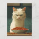 Bilden skildrar en vit katt med ett allvarligt, nästan missnöjt uttryck som börjar intensivt vid en fullt kattfoder framför sig. Bakgrunden har mörk grönt plattor, vilket ökar den fokuserade och något dramatiska stämningen. Kattens päls är detaljerat, och dess grönt ögon är snävt, ge den en stark och dominerande närvaro. Hela stil påminner om vektorkonst, med rent linjer och fet färg.