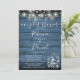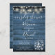 En inbjudan till möhippan Rustic par som innehåller söt string ljus och Mason burk med snyggt script typography, på en blå bakgrund av rustiskt trä. Designad av Thisisnotme©