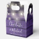 Rustic bröllopsförmånslåda med söt sträng ljus, chic namnteckning skript namn och speciellt datum på en lila träpanelbakgrund. Du kan anpassa dig med ditt eget tack till ditt meddelande på motsatt sida. Ett perfekt sätt att tacka gästerna! Designad av Thisisnotme©