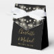 Elegant black and guld bröllopsruta med söt string ljus, snyggt namnteckning skript namn och speciellt datum angivet i modern typografi. Du kan anpassa dig med ditt eget tackmeddelande under locket. Ett perfekt sätt att tacka gästerna! Designad av Thisisnotme©
