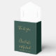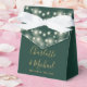 Elegant emerald grönt och guld bröllopsförmånslåda med söt string ljus, snyggt namnteckning skript namn och speciellt datum angivet i modern typografi. Du kan anpassa dig med ditt eget tackmeddelande under locket. Ett perfekt sätt att tacka gästerna! Designad av Thisisnotme©