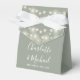 Elegant Sage grönt bröllopsruta med söt sträng ljus, snyggt namnteckning skript namn och speciellt datum angivet i modern typografi. Du kan anpassa dig med ditt eget tackmeddelande under locket. Ett perfekt sätt att tacka gästerna! Designad av Thisisnotme©