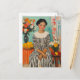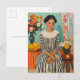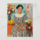 En sjudande vintage-stil-målning av en påklädd kvinna i en svartvitt stripe, som sitter mellan två färgade blommigtar och färska frukter. Scenen utstrålar charm med fet färg, uttryckliga penseldrag och en nostalgisk, postimponerande estetisk påminnelse om Matisse.