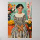 En sjudande vintage-stil-målning av en påklädd kvinna i en svartvitt stripe, som sitter mellan två färgade blommigtar och färska frukter. Scenen utstrålar charm med fet färg, uttryckliga penseldrag och en nostalgisk, postimponerande estetisk påminnelse om Matisse.