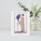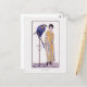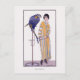Ett vykort med illustrationen mode 1914, Saut de Lit, av den danska konstnären Gerda Wegener (1886-1940). En kvinna som står bredvid en blå papegoja i en gult och en ljusblå, strimlad hytte (robe). En digitalt förbättrad bild från Fransk mode-tidskriften Costumes Parisiens.