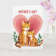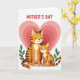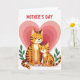 This card shows two stylized striped cats, with the larger one gently holding the smaller close, their closed eyes and small smiles suggesting quiet closeness ❤️. Their fur is shaded in warm orange and brown stripes, with soft shadowing that gives the figures a little depth without looking heavy. Behind them sits a large, layered heart made of concentric rings in pale pink and blush, wrapping the pair in a romantic, cozy backdrop. Small green sprigs appear on both sides, adding a fresh touch like little garden leaves 🌼. The background stays white so the warm stripes and pink heart shapes stand out clearly. Near the top, a short line of red text is centered and spaced above the illustration, acting like a gentle header. The cats’ paws overlap slightly at the middle, making their cuddle feel protective and friendly. The concentric heart behind them shifts from deeper pink near the center to lighter pink toward the outer edge.