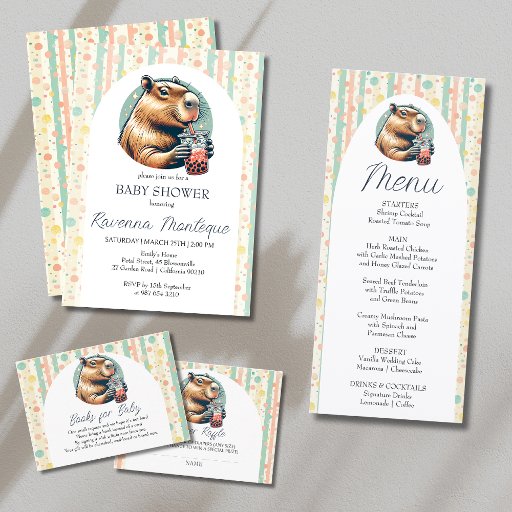 These pastel baby shower napkins feature a funny capybara with bubble tea on a colorful dotted stripe background. The playful and trendy design makes them a perfect personalized party detail.
