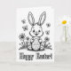 Designed with a monochrome illustration, the card features a friendly bunny 🐰 with long ears framing a bright, open smile and shining eyes. The bunny sits in a relaxed pose on a patch of grass, holding a decorated egg close to its chest as if sharing a quiet, affectionate moment with the viewer. Simple bands and wavy lines wrap around the egg, giving it a festive look without adding extra colors. Around the bunny, small wildflowers dot the ground, and three tiny winged insects hover overhead, adding gentle movement to the scene 🌷. The shading uses soft gradients and fine outlines to give the bunny’s fur and the egg’s surface a slightly textured, touchable look. A short Easter greeting appears centered beneath the illustration in dark lettering, standing out clearly against the light background. Above the bunny, the open space stays uncluttered, while the grass blades and flower petals are drawn in thin black lines with light gray shading.