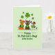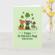 This card shows three cartoon-style puppies lined up side by side on a pale green background, their cheeks lifted in wide grins as they lean subtly toward one another like close friends in a photo. A tan pup wears a green sweater with a white shamrock on the chest, a chocolate-brown pup has a lime-green bandana at the neck, and a white-and-brown patched pup sports a green-and-yellow striped jumper, all topped off with oversized green-rimmed glasses that match. Above their heads, scattered shamrocks in different sizes drift across the top area, adding a festive sprinkle of ☘️. The pups’ bright eyes and slightly tilted heads create a tender, affectionate energy, as if they’re sharing a private joke together. Along the bottom, the message “Happy St. Patrick’s Day! Little Brother,” is set as a single line of green text centered beneath the trio. The green tones repeat through the clothing, glasses, and shamrocks, tying everything together with a soft, cheerful look 💚. The final touch is the cluster of floating shamrocks hovering above the puppies against the pale green field.