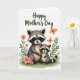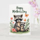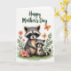 Designed with two stylized woodland animals, a larger adult and a smaller youngster, cuddled close on a patch of green grass, their masked faces turned toward each other in a tender, trusting gaze ❤️. Their fur is soft gray with warm cream touches, and their striped tails curl gently along the ground, adding to the cozy closeness. Coral-pink blossoms and leafy green stems frame them like a garden border, hinting at a sweet, friendly bond through their gentle embrace. Near the top center, a Mother’s Day message appears in dark green cursive lettering against the white background, easy to spot without crowding the art. Two small orange-winged insects drift above the pair, bringing a light sense of motion to the open space. The colors stay calm and springlike—muted grays, creamy highlights, fresh greens, and soft pinks—while the brushy illustration style keeps everything storybook-soft 🌼. The background remains bright white, with the flowers clustered along the sides and the two orange insects hovering just above the text.