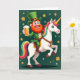 This St. Patrick's Day card shows a cheerful leprechaun riding a white unicorn against a deep emerald green background sprinkled with golden four-leaf clovers and tiny starbursts. The leprechaun grins wide with rosy cheeks and bright blue eyes, and his fiery orange beard stands out against his neat green suit and tall hat with a gold buckle. He lifts a frothy pint of golden ale as if toasting a close friend, leaning forward with an easy, companionable confidence. The unicorn looks back with a gentle smile and soft blue eyes framed by long lashes, giving the pair a sweet, in-on-the-joke closeness. A rainbow mane and tail flow in smooth bands from pink to purple, adding a little 🌈 magic to the scene. Near the top, St. Patrick’s Day words sit in light gold lettering that contrasts clearly with the green, with a small ☘️ tucked nearby. Gold clovers dot the space around them, and the unicorn’s spiraled golden horn gleams at the center of its forehead.