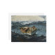 En ensam man i en liten båt navigerar i ett turbulent hav omgivet av illavarslande hajar. Den dramatiska havsscenen sprider spänning och överlevnad mitt i naturens makt. Konstnär: Winslow Homer