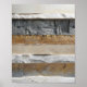 Bilden visar en närbild av en struktur i lager. Lagrar är placerat horisontellt, var och en med ett avgränsat färg och mönster. Det övre lagrar är ett glatt, benvitt yta, följt av ett texturerat grått lagrar som liknar grovhuggen sten. Under detta ligger lagrar i guld med ett sprucket utseende av åldras.